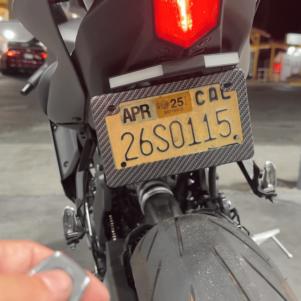 The Fantom Motorcycle Privacy Blackout Plate is an ultra-thin, weatherproof license plate cover motorcycle kit. It switches from clear to opaque black with the touch of a button, powered by your vehicle’s 12 V battery.